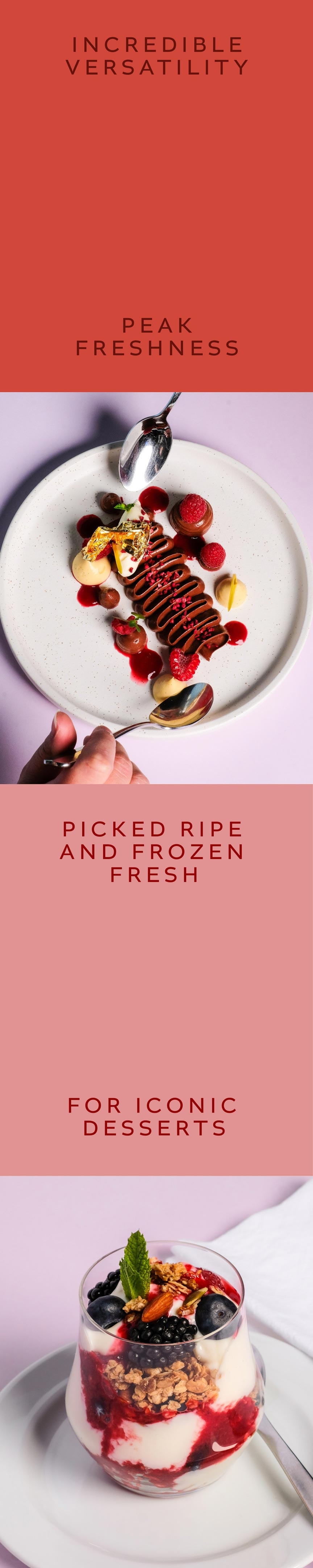 Visually, the brand took cues from health food, contemporary grocery, premium produce and luxury food packaging. The goal was to elevate frozen ingredients without pretending they were something else. Tight, textural food photography became a major part of the system. Mango pulp, berries, vegetables and herbs were treated with detail and drama. Cropped close, rich in texture, full of colour. A reminder that frozen can still be beautiful. Colour became the core brand language. Each product was assigned its own considered palette, drawn directly from the ingredient itself. A light, mid and dark tone created a flexible colour system that could carry across packaging, website, marketing and campaign assets. The result is a full spectrum of food, organised with precision but still bursting with life. It gives every product its own personality while keeping the range connected.